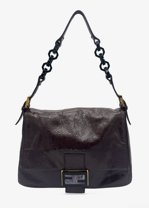 A cult favorite from Fendi’s early-2000s archive, this Medium Mamma bag is rendered in glossy plum patent leather with a naturally crinkled finish that shifts between wine and aubergine in the light. The softly structured silhouette tucks comfortably under the arm, finished with mixed chain-and-leather straps and the signature oversized FF logo clasp framed in gold-tone hardware.