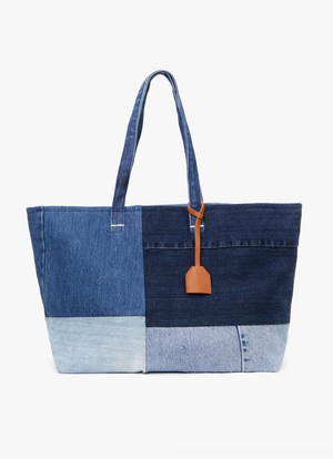 One-of-a-kind washed denim patchwork tote bag.