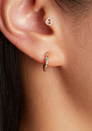 10k yellow gold huggie adorned with a rainbow of gemstones.