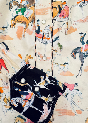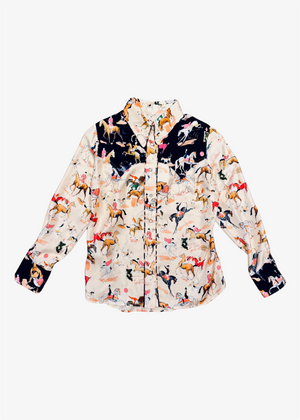 Long-sleeved shirt in silk twill with contrasted western style yokes and cuffs, featuring contrast piping details along button pad and collar. snap buttons.