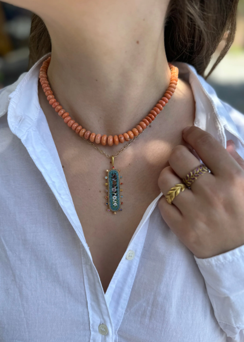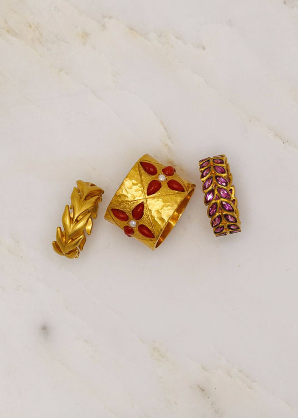 Pictured alongside Cathy Waterman's Coral and Pearl Wide Band and Pink Sapphire Branched Ring.