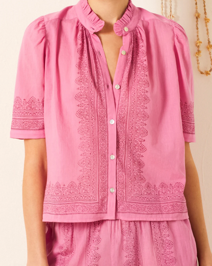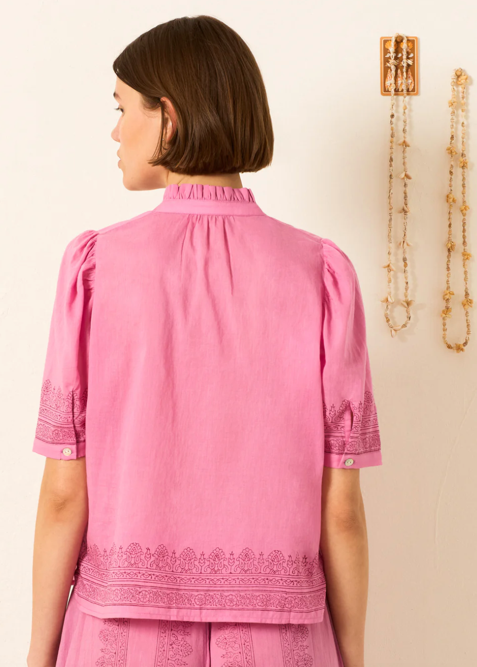 A perennial favorite from Alix of Bohemia, the Winn shirt has puff shoulders and a feminine ruffled collar. This cotton voile shirt is hand-block-printed with an ornate border-print motif.
