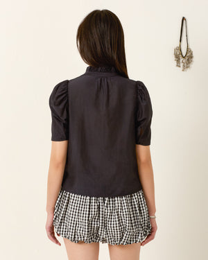 A perennial favorite, the Winn has puff shoulders and a feminine ruffled collar. This cotton-silk blend shirt is appliquéd with a handmade stemmed daisy.