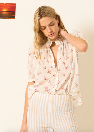 Individually cut by hand, the cotton-silk blend Winnie shirt has short puffed sleeves, a ruffled collar, and a mother-of-pearl button front. The vintage-inspired shirt is hand-block printed with an avian motif.