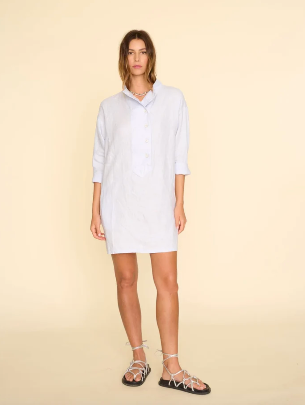 Made in lightweight linen, the Dover is a tunic dress with a mock neck, wide button-front placket with offset buttons, seam details at the waist, and side seam pockets.