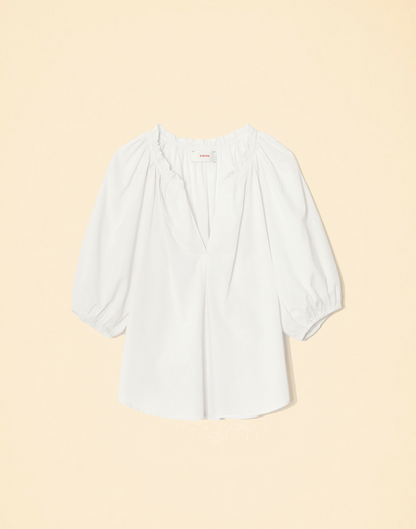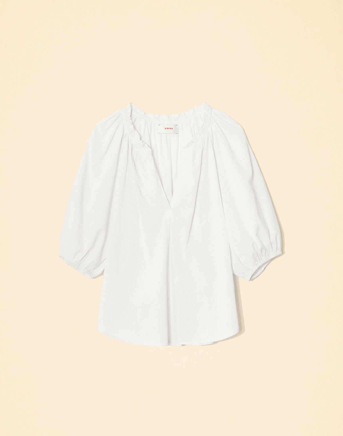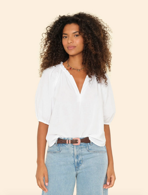 Made in lightweight woven cotton poplin for a lived-in look and feel,Jules isan easy popover with a ruffle neckline and bubble sleeves with an elastic cuff.