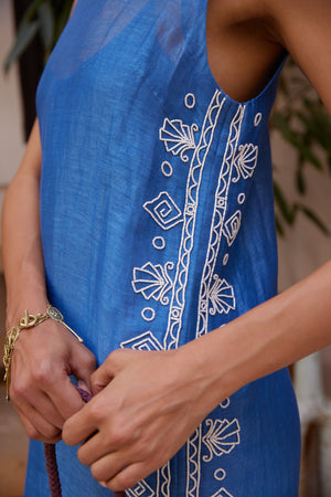 This dress leans into a relaxed, kaftan-inspired shape with a polished twist. Cut in a sheer blue silk linen, it skims the body with an easy drape and open side slits that show just enough leg. The magic is in the details: crisp white beadwork runs in a border design along the sides and neckline, forming graphic motifs that feel artisanal rather than flashy. It’s lightweight, breezy, and quietly striking — the kind of piece you pack first for warm-weather escapes.